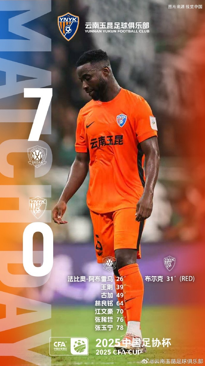 在2025年中国足协杯半决赛中,作客的云南玉昆队最终0比7负于对手。比赛关键转折出现在第31分钟,布尔克领到红牌被罚出场。很遗憾,云南玉昆未能延续改写云南足球历史的脚步,止步于决赛门前。在此向所有支持球队的球迷致以诚挚歉意。